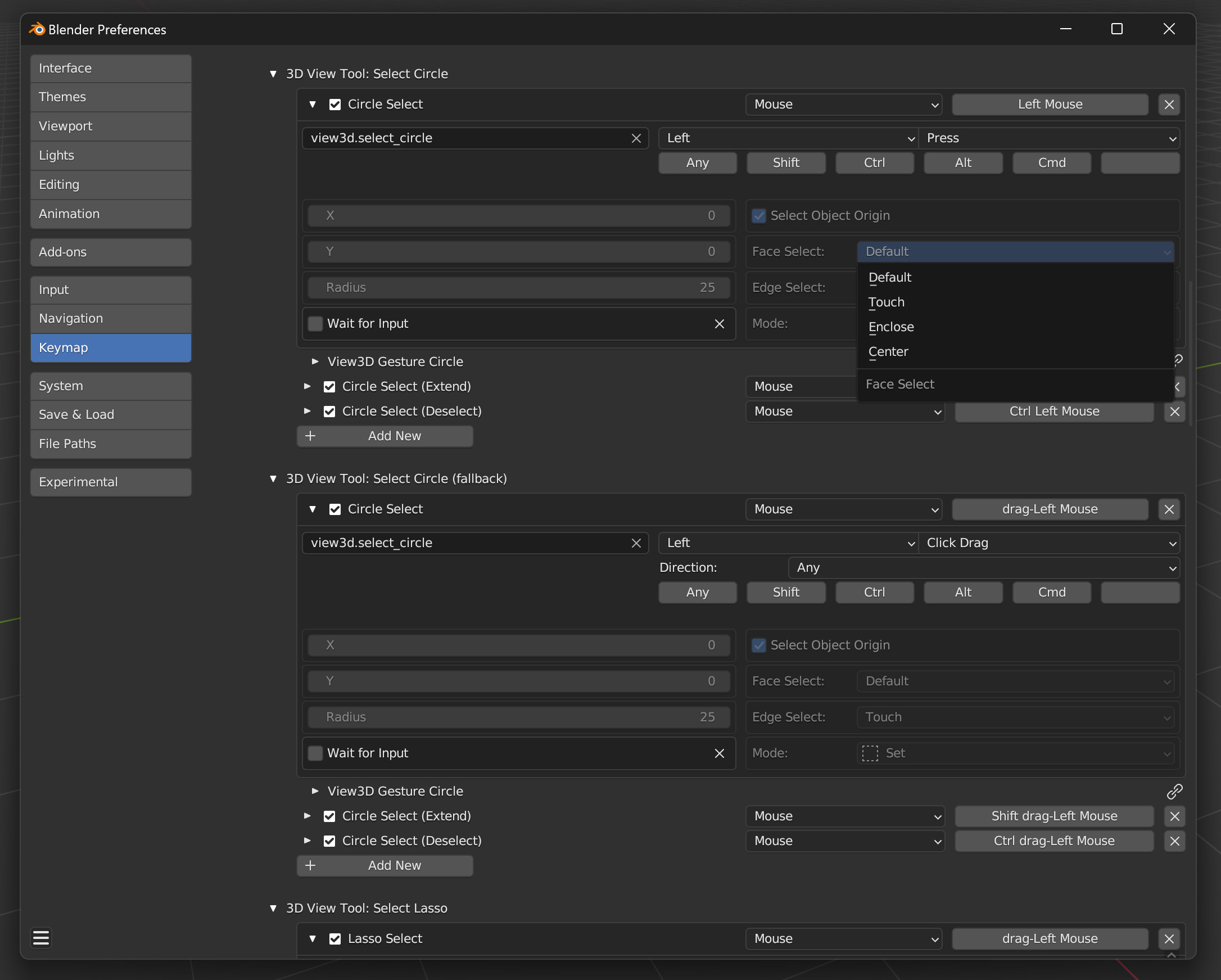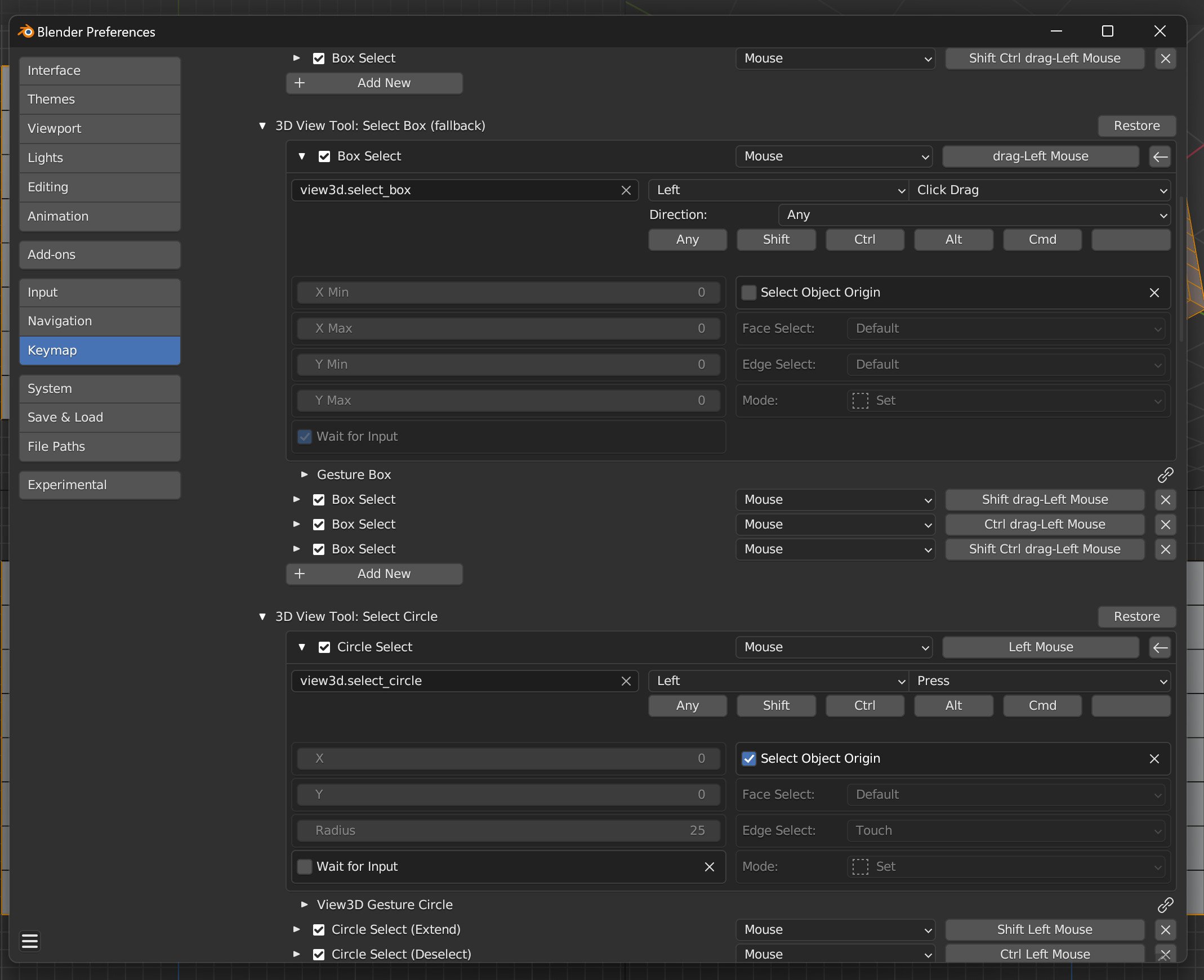 This feature is incomplete, but functional. Circle is forced to select objects by their origin, while Box cannot do this. There's a checkbox called Select Object Origin in the Keymap. It's a little off, an object's origin can be still be selected when it is behind something else if some other part of that object is inside the selection area. Also, the selection area for Circle is larger than it appears when origin is off. One more thing: I couldn't get Lasso working right, so I left it out. If you need more options for object select, there's an addon called X-Ray Selection Tools that should work pretty good. Automatic X-Ray is inspired by a feature from that addon, it was added to my build at the request of Hologram.