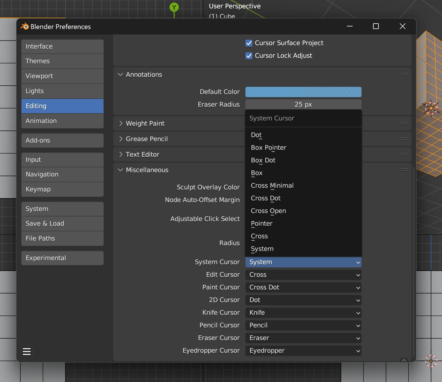 Preferences->Editing at the bottom of Miscellaneous. You'll need to move your cursor in and out of whatever area they're from to see the change take effect. If you are on Mac or Linux, most of the cursor options don't work, but System and Cross should show up correctly if you'd like them as an alternative for any cursor. I'll expand on this feature if there's interest.