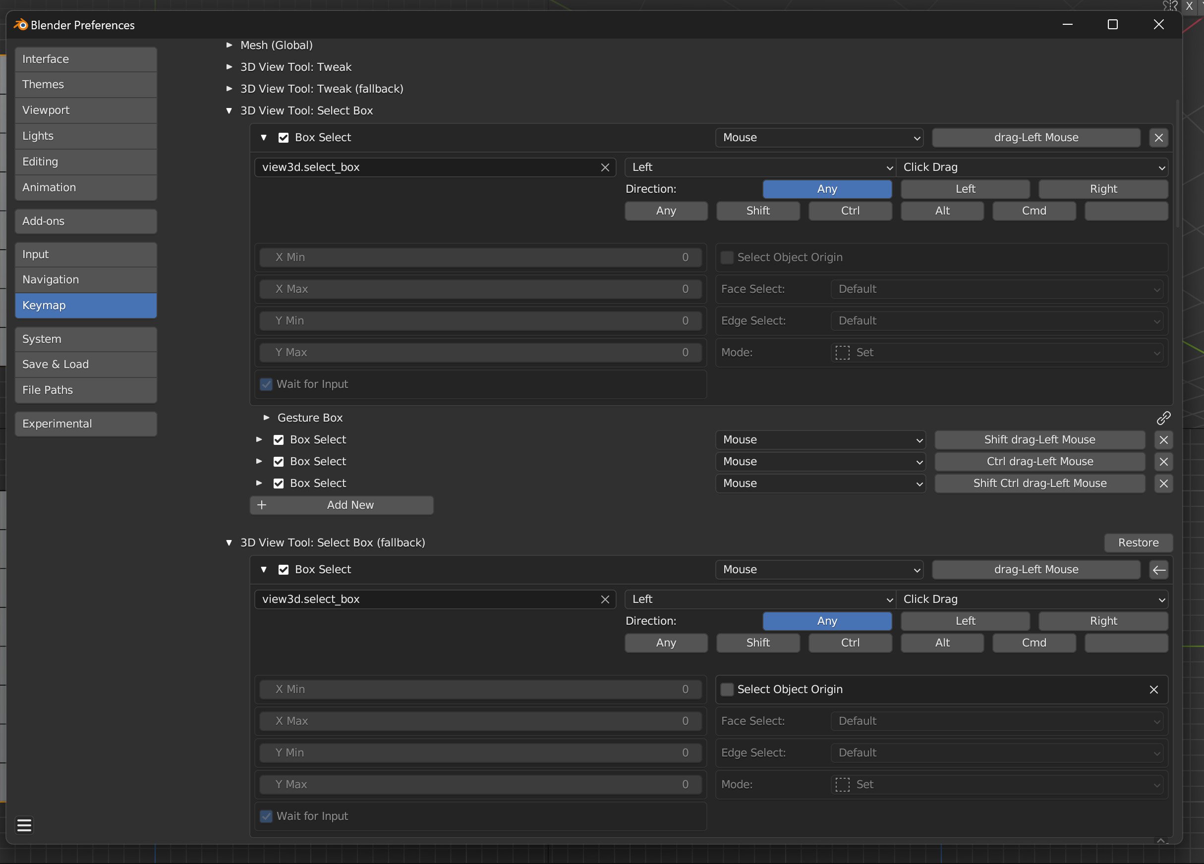 With Blender's way, try to set Box select to Extend when dragging left aka West, and Subtract when dragging right aka East. If you don't initiate the mouse drag within 45 degrees of left or right, you get a Tweak Event instead of what you expected. There's a way to make this work better. You set Extend to Any, and Subtract to East, Northeast, and Southeast. The Keymap item set to Any needs to be after the other 3 or they'll be undetectable. Not intuitive, didn't figure out this was possible until after making this feature.