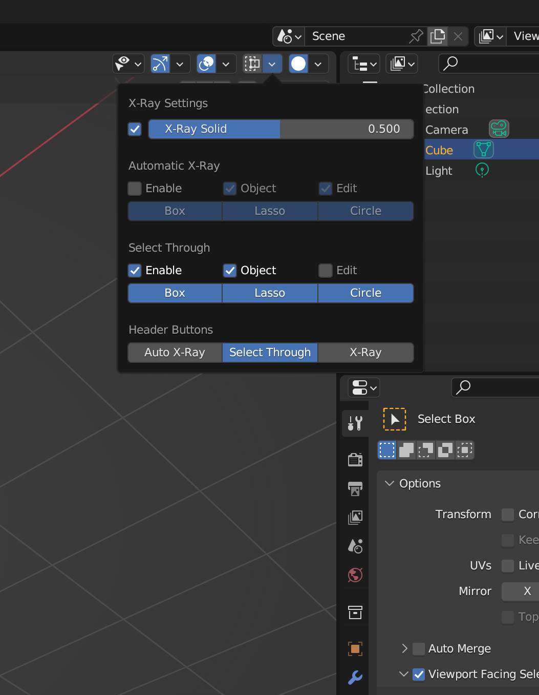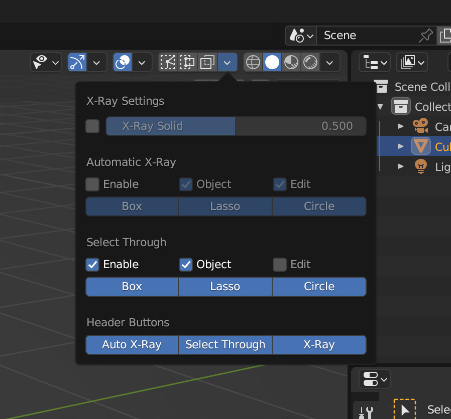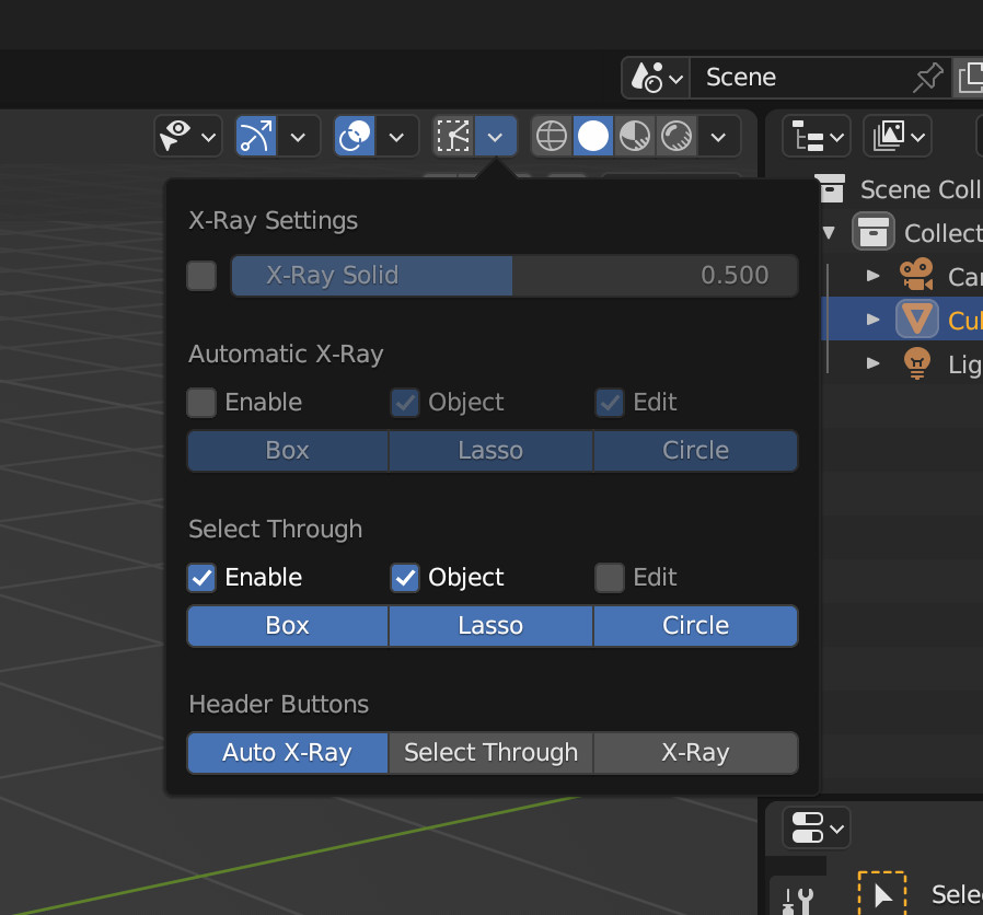 Blender doesn't select unseen mesh. You select what you can see. If you want to select something on the other side of your mesh, you'd either turn on X-Ray or move the camera until it's visible. With objects you always select through, and can't turn it off. Not anymore. In the Header you'll find a popover next to the X-Ray button. I moved the X-Ray settings here from the Shading Popover. They have new names so it's more clear that wireframe and solid have separate X-Ray properties.