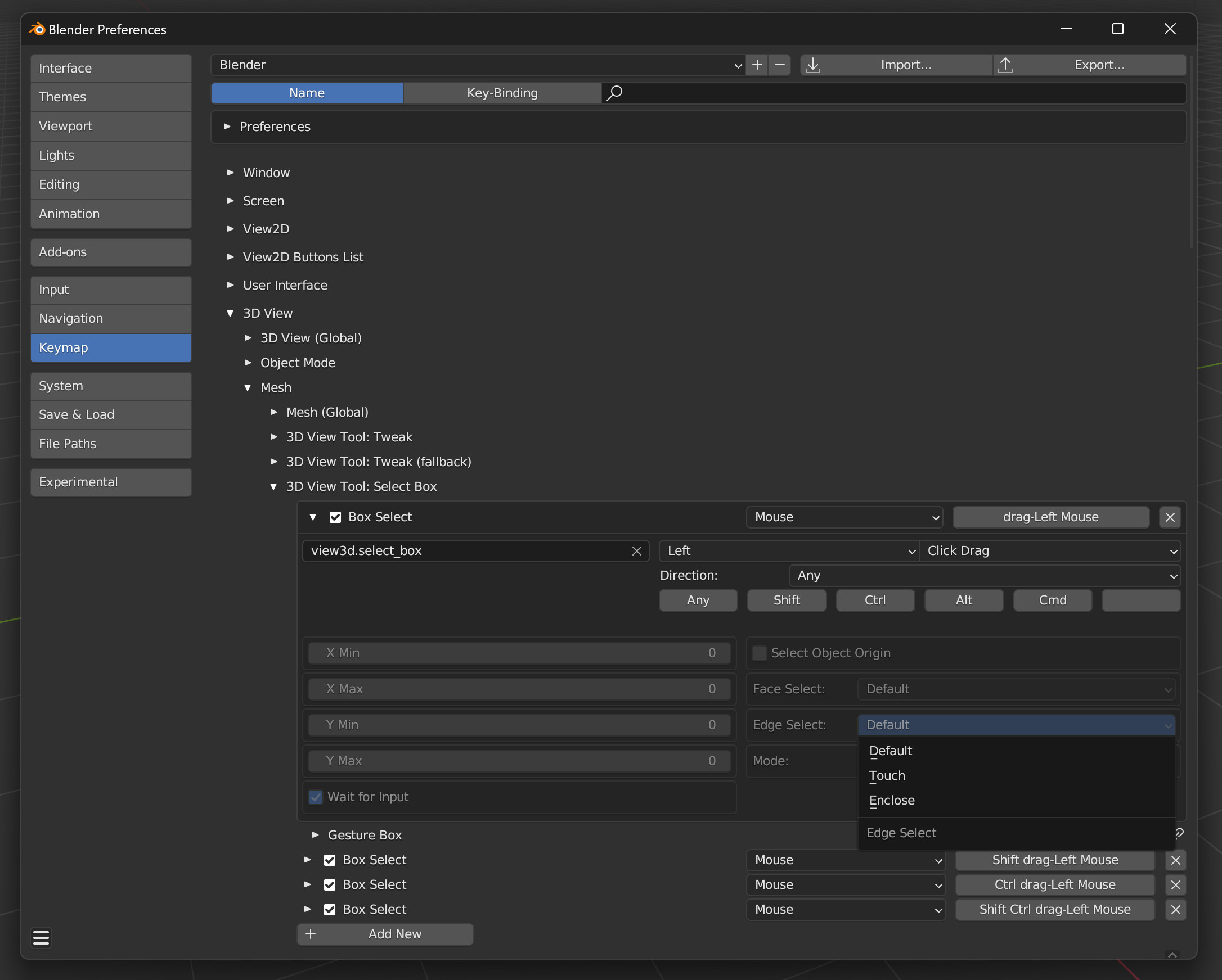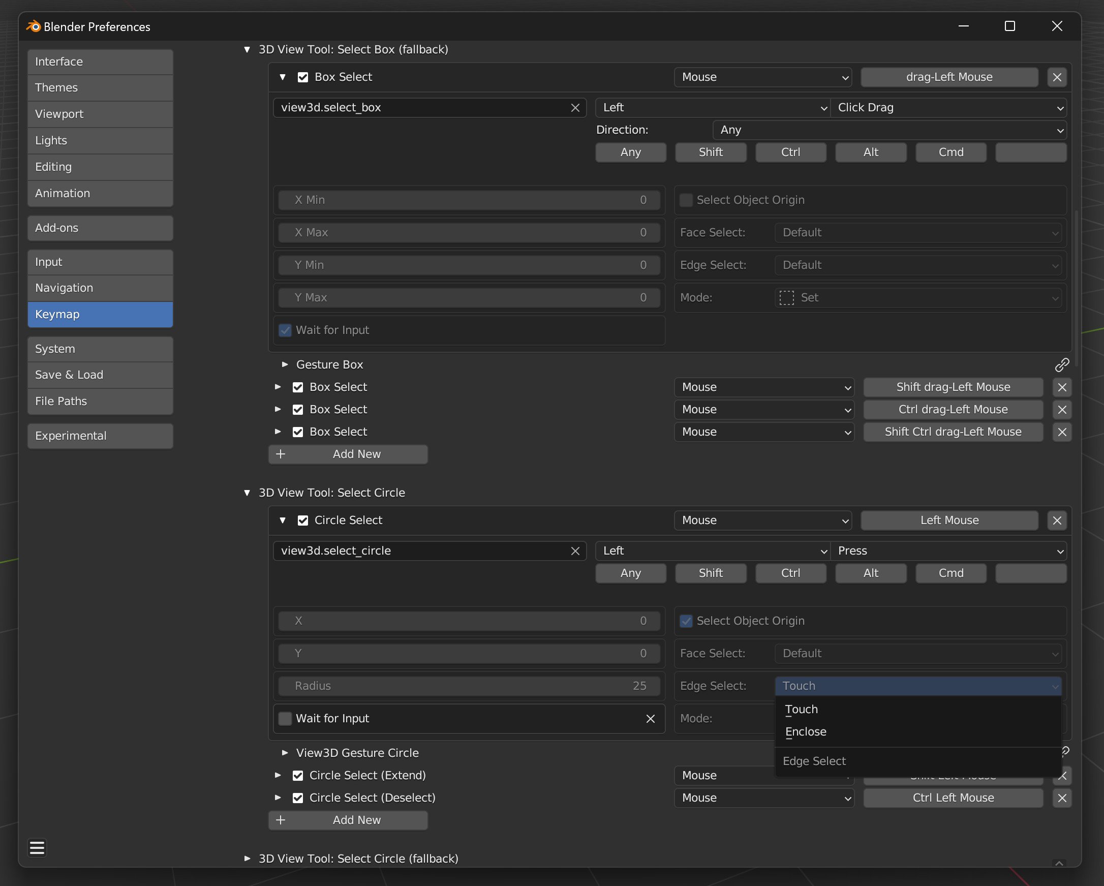 Preferences->Keymap->3d View->Mesh->(Box / Circle / Lasso) Select