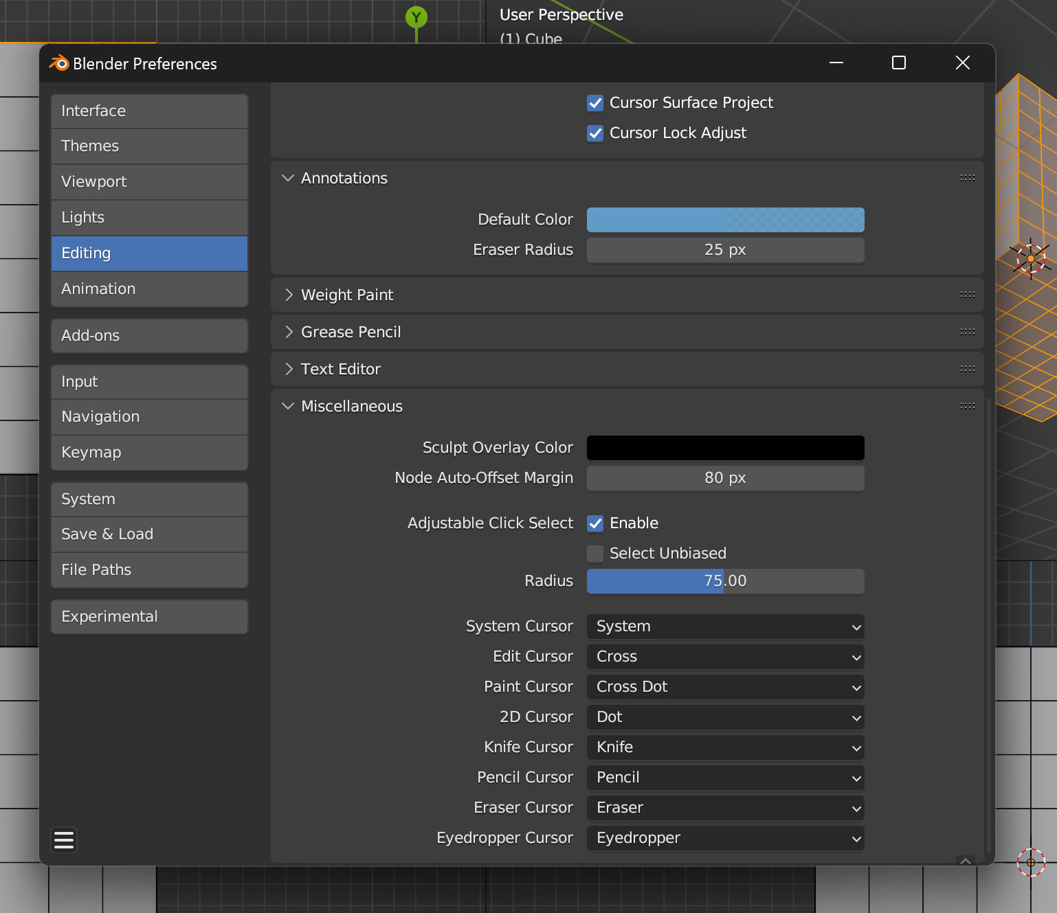 Single-click an edge, vertex, or facedot and there's a pretty big area you can grab it from. Faces in near select have zero radius, so you have to be right on top of them. I made this adjustable and consistent. Faces act the same, and you can change the size of the selection radius. Blender gives unselected mesh a slight bias, this can be turned off.
