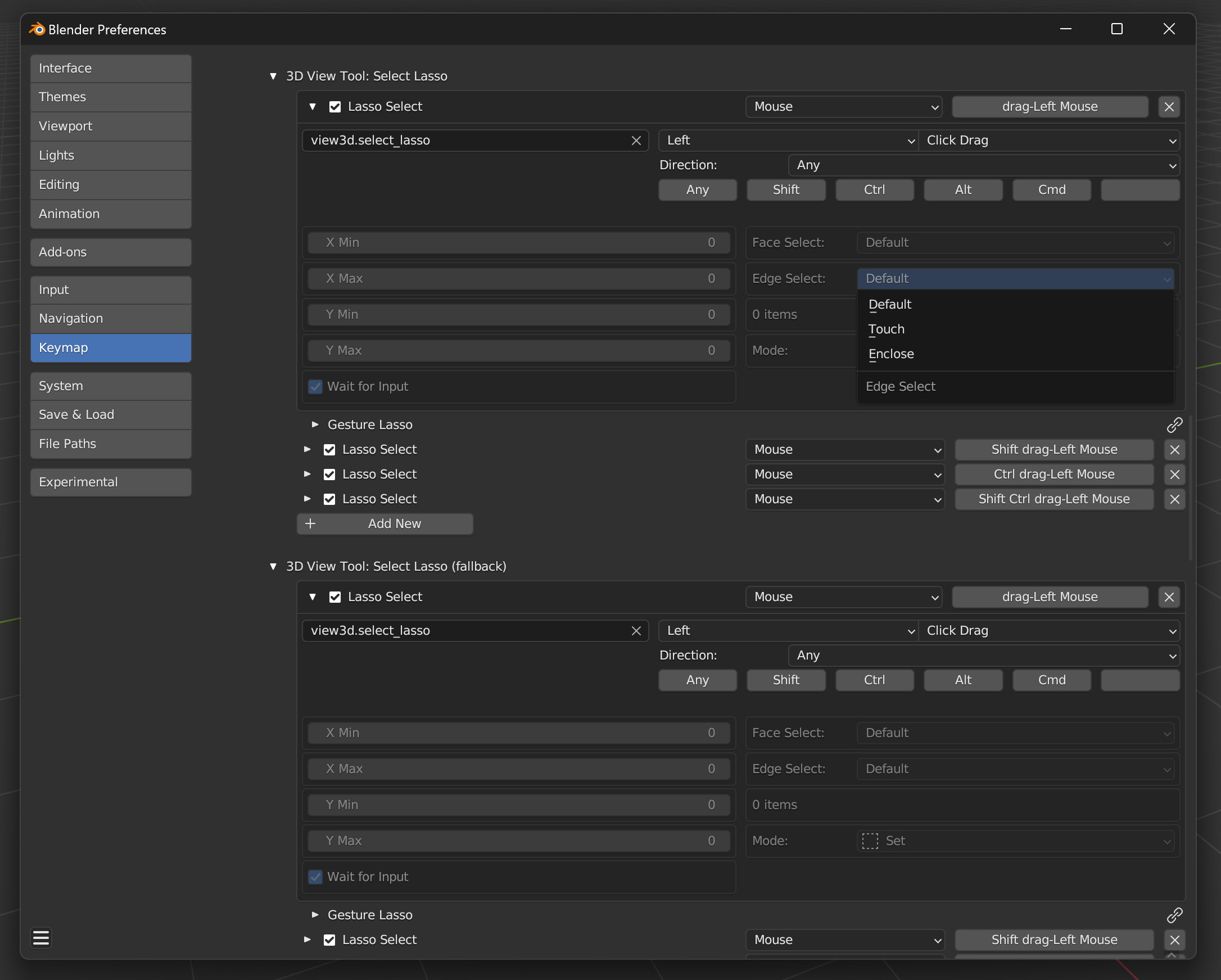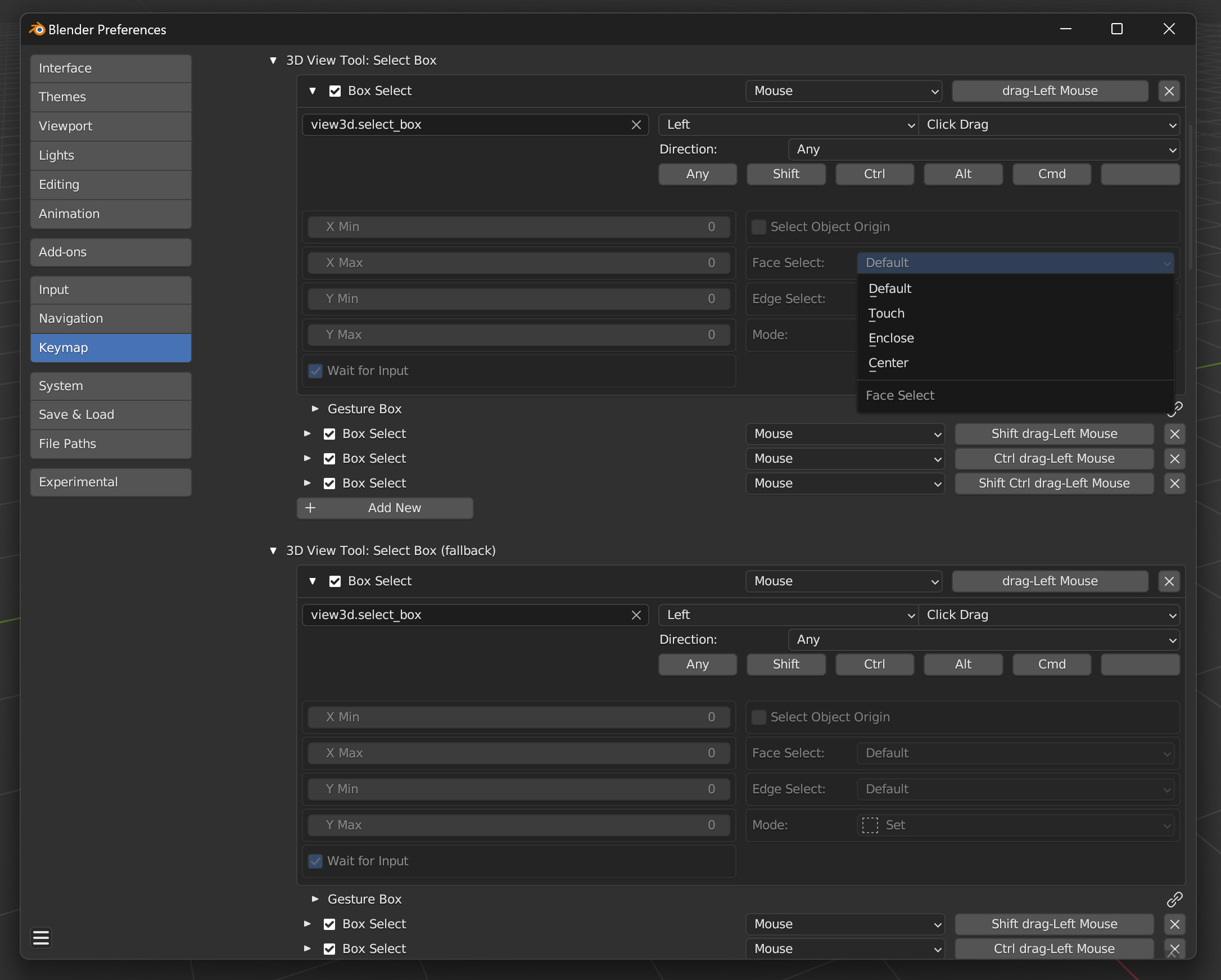 Preferences->Keymap->3d View->Mesh->(Box / Circle / Lasso) Select