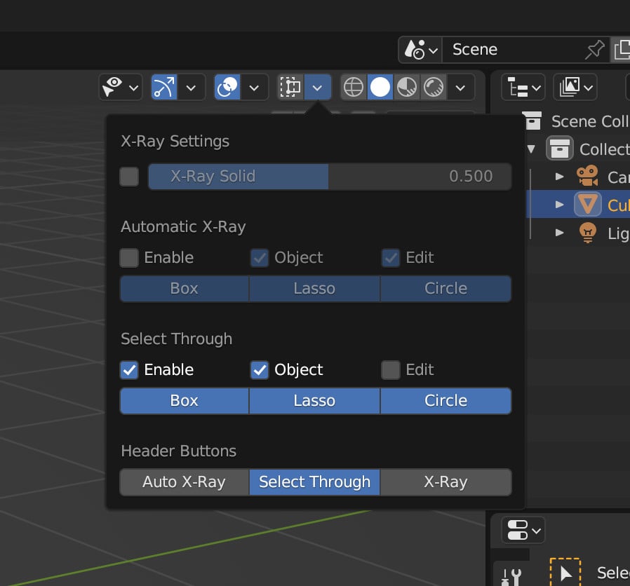 Blender doesn't select unseen mesh. You select what you can see. If you want to select something on the other side of your mesh, you'd either turn on X-Ray or move the camera until it's visible. With objects you always select through, and can't turn it off. Not anymore. In the Header you'll find a popover next to the X-Ray button. I moved the X-Ray settings here from the Shading Popover. They have new names so it's more clear that wireframe and solid have separate X-Ray properties.